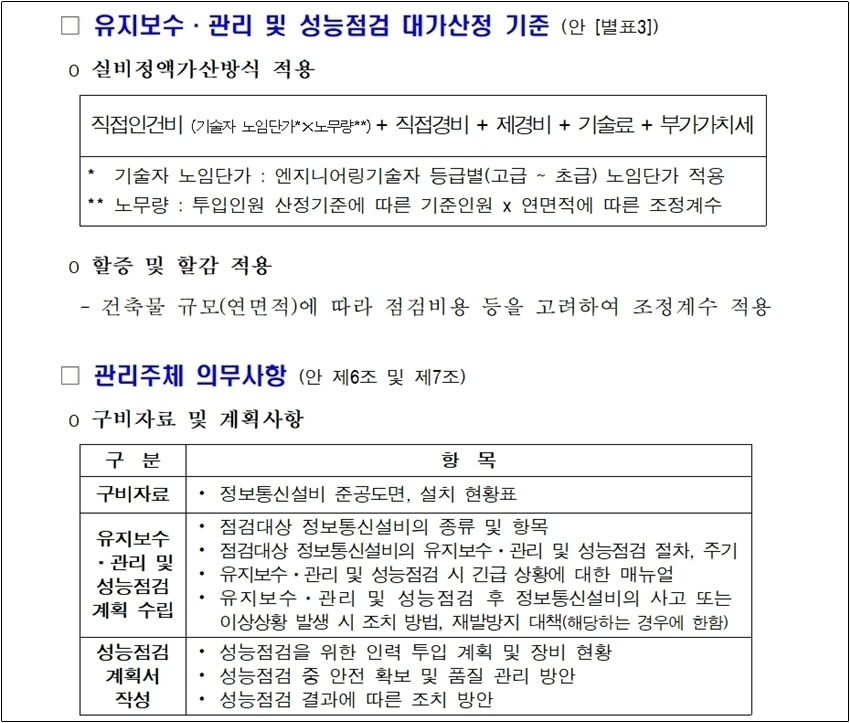 이와 함께 과기정통부는 유지보수·관리기준의 구체적인 내용과 방법, 절차 등은 정보통신공사업법 시행규칙에 명시할 방침이다. 또한 유지보수·관리 및 성능점검 대상설비, 대가산정 기준 등은 관련 고시에 명시하기로 했다.