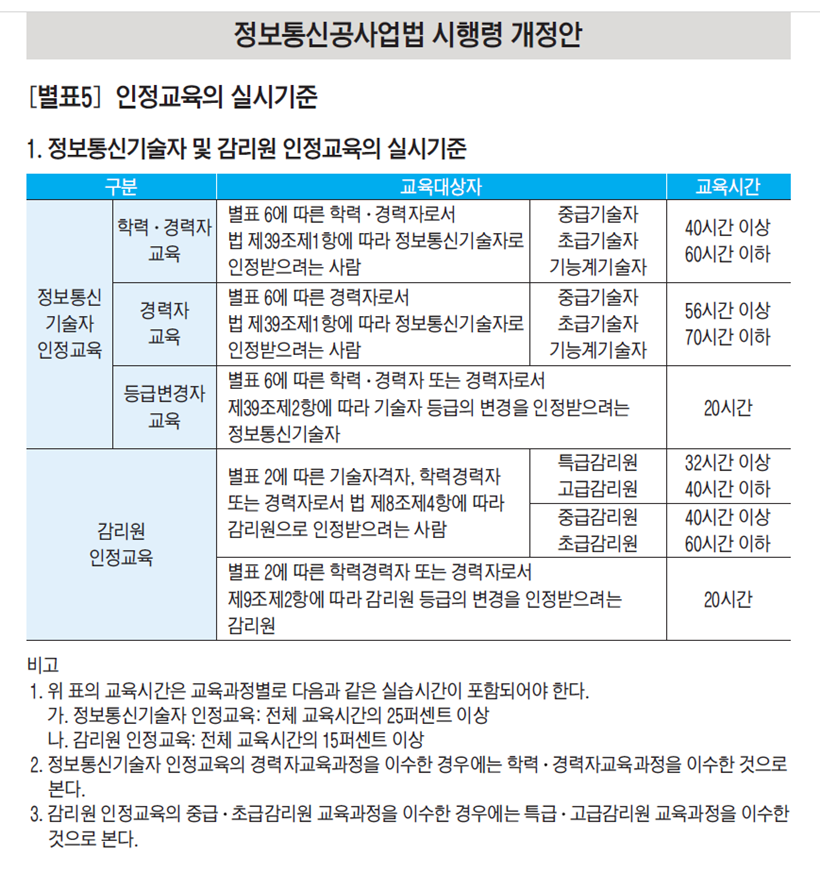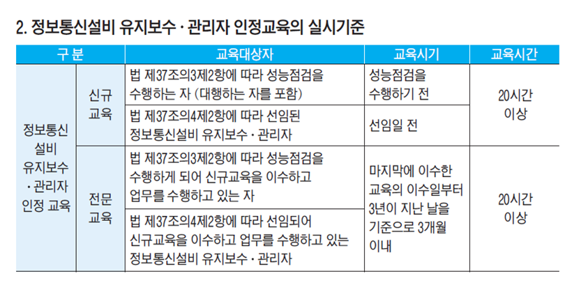 이와 함께 정보통신설비 유지보수·관리자의 자격기준을 정보통신설비 관련업무를 수행하고 있는 정보통신기술자의 자격기준을 준용하도록 규정했다. 즉, 관리주체로 하여금 정보통신설비 유지보수·관리 인정교육을 받은 기술계 정보통신기술자를 유지보수·관리자로 선임하도록 했다. 이에 더해 정보통신기술자 및 감리원의 인정교육 실시기준과 정보통신설비 유지보수 관리원의 인정교육 실시기준을 ‘별표 5’에 명시했다.