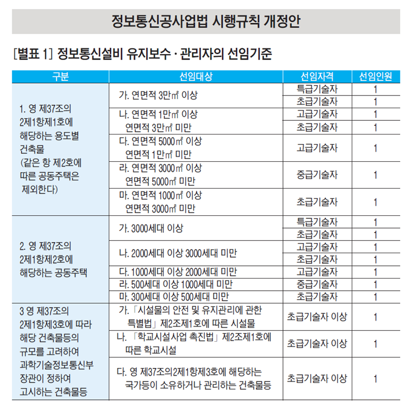 또한 정보통신설비 유지보수·관리자의 선임기준을 대상 건축물의 연면적 또는 공동주택(아파트)의 세대수에 따라 정보통신기술자를 각 등급별로 배치하도록 규정했다.