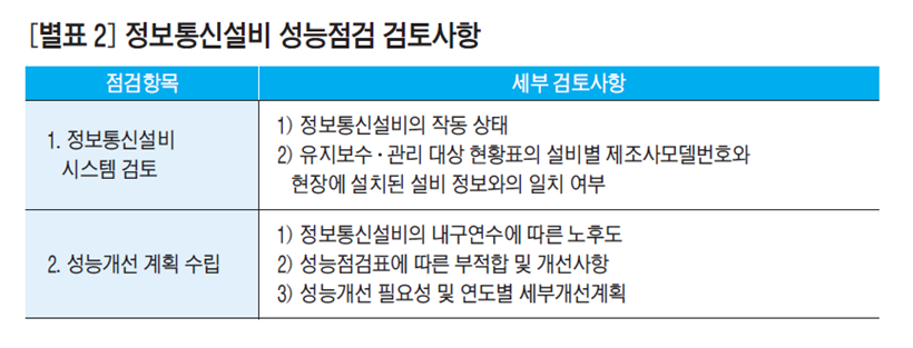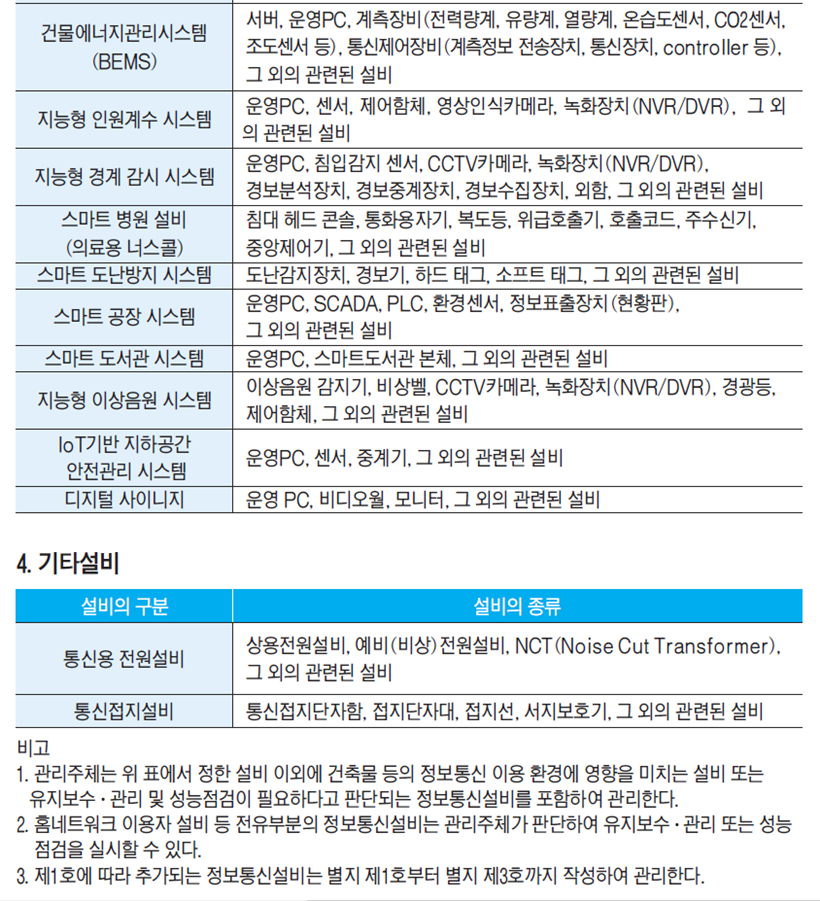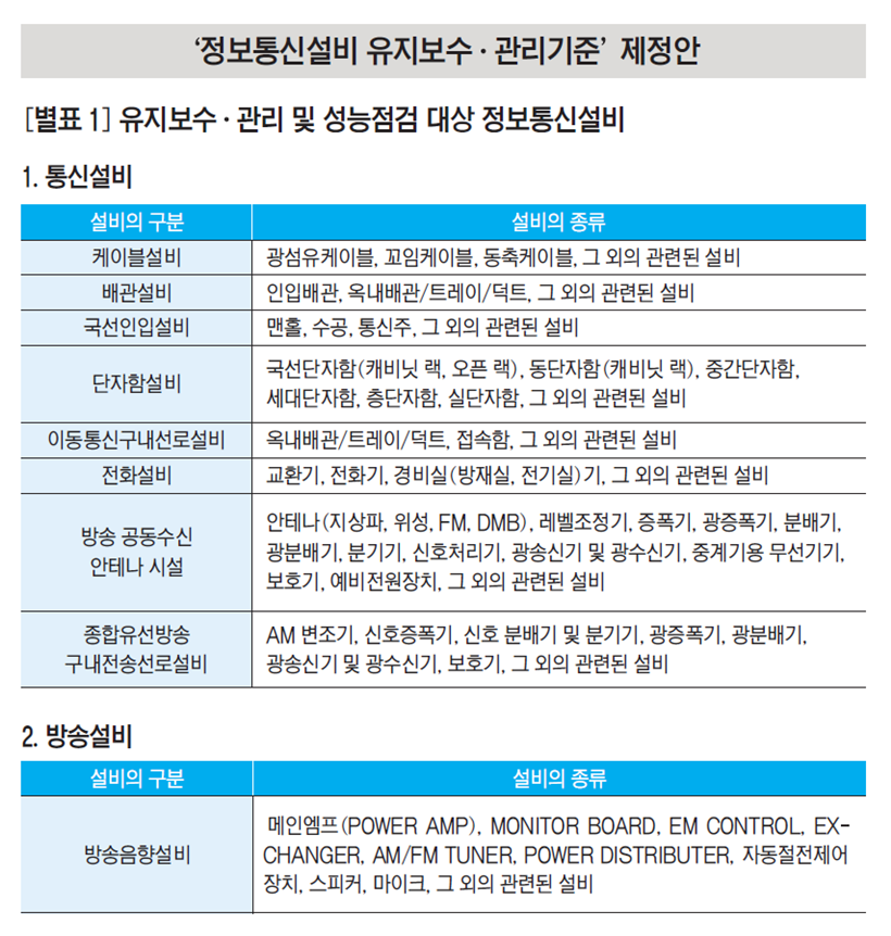 이와 함께 정보통신설비의 유지보수·관리의 점검대상 및 방법, 주기 등을 규정하고 고장 등 발생 시 필요 조치에 대해 규정했다. 유지보수·관리 및 성능점검 대상 정보통신설비는 크게 △통신설비 △방송설비 △정보설비 △기타설비로 나뉜다.