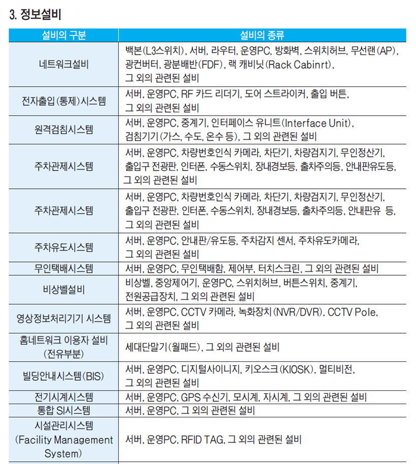 여기서 통신설비는 케이블 설비, 배관설비 등 8개 설비로 구분된다. 방송설비는 방송음향설비를 의미하며, 정보설비는 네트워크설비와 전자출입(통제)시스템 등 24개 설비로 구분된다. 기타설비는 통신용 전원설비와 통신접지설비로 구분된다.